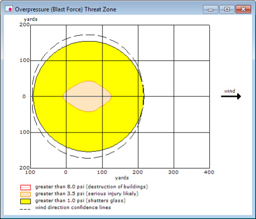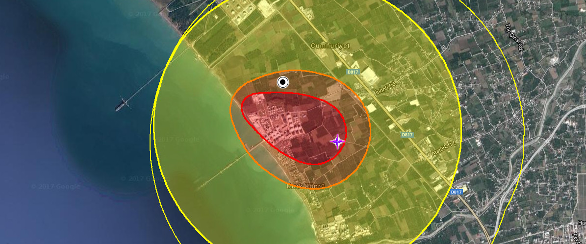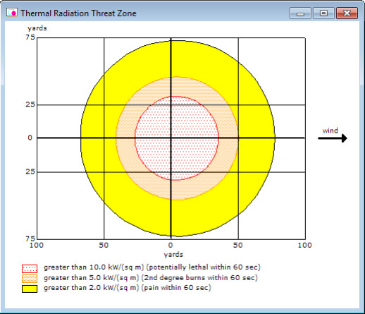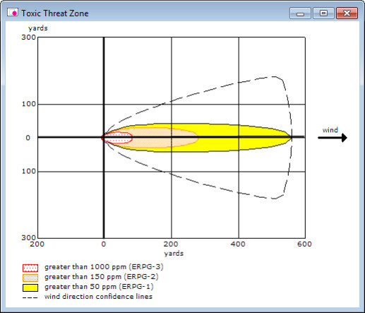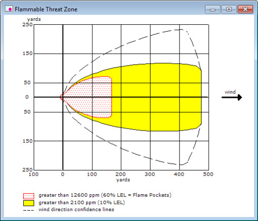 Yukarıdaki tüm verilerin girilmesinden sonra tehlikeli bölge sınırları belirlenebilmektedir. İstenildiği takdirde yardımcı program kullanılarak tesis yerleşimi üzerinde seçilen senaryo uyarınca tehlikeli bölgeler haritalandırılabilmektedir.