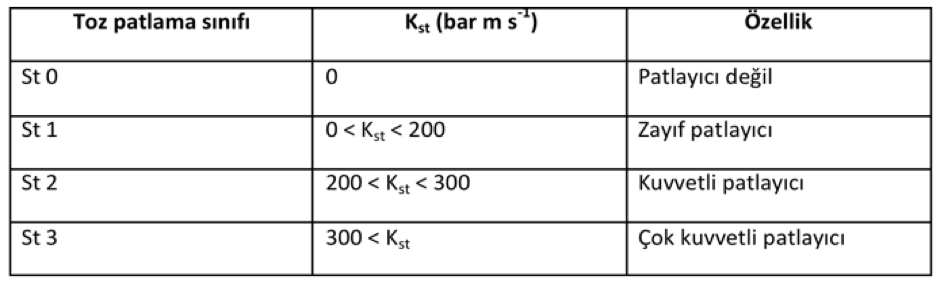 - Toz Patlama Sabiti (Kst): Patlama şiddetinin bir göstergesi olup, hava toz karışımının kapalı bir kapta ürettiği azami basınç değişimidir. Diğer bir tabir ile basıncın zamana göre azami yükselme değeridir. Tozlar için en önemli tehlike ve tahribat belirleyici değer Kst değeridir. Tozların Kst değerine göre patlayıcılık özellikleri, aşağıdaki tabloda verilmiştir: