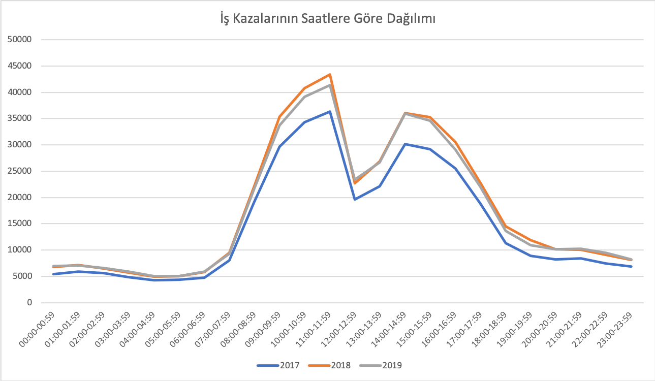 İş kazalarının saatlerine göre dağılımına bakıldığında kazaların en çok saat 11:00-11:59 aralığında olduğu görülmektedir. Kazaların ara dinlenmeleri ve mesai sonlarına yakın saatlerde yorgunluk, açlık, dikkatsizlik vb nedenlerden dolayı daha sık gerçekleştiği söylenebilir.
