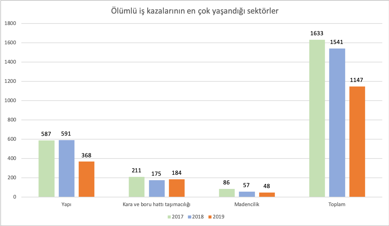Ölümlü iş kazaları her yıl olduğu gibi en çok yapı işlerinde gerçekleşmektedir. Ölümlü iş kazalarının yaklaşık 1/3'ü inşaat işlerinde meydana gelmektedir. Grafikte 2017, 2018 ve 2019 yıllarında gereçekleşen ölümlü iş kazalarının sektörel karşılaştırılması verilmiştir.