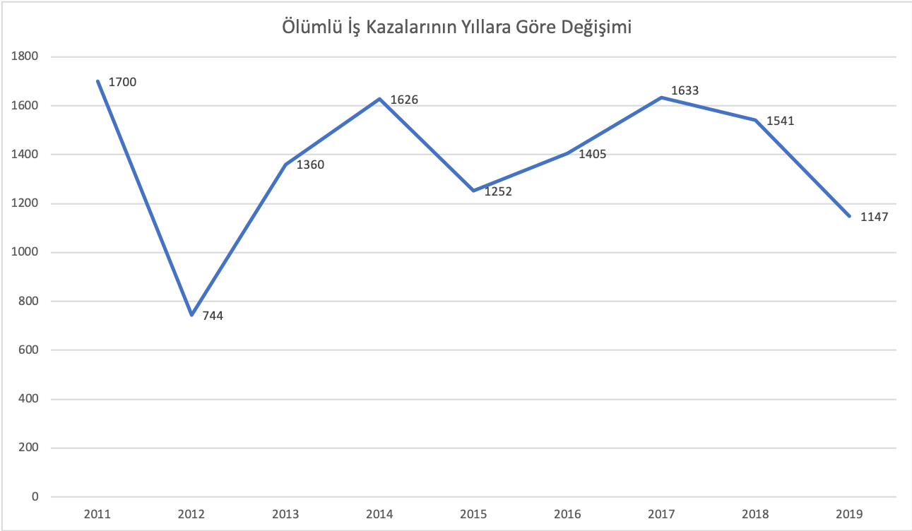Ölümlü iş kazalarının sayılarına bakıldığında 2017 senesinden sonra kademeli bir azalma olduğundan bahsedilebilir. 2019 senesinde toplam 1147 kişi iş kazası sonucunda hayatını kaybetmiştir.