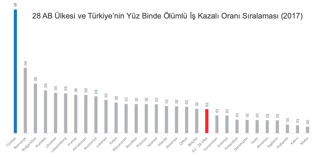Ölümlü iş kazalarının sayısı bakımından Türkiye, Avrupa Birliği ülkeleri arasında birinci sırada yer almaktadır. 2017 senesi verileri göz önüne alındığında, Türkiye yüz binde ölümlü iş kazası oranında AB ortalamasının 4,5 katı üzerinde olduğu görülmektedir.