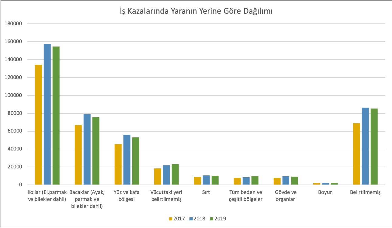 İş kazalarında yaranın yerine göre dağılımına bakıldığında en çok kollar (el, el bileği ve parmaklar dahil), ikinci sırada bacaklar (ayak, ayak bileği ve parmaklar dahil) ve üçüncü sırada ise yüz ve kafa bölgesi gelmektedir.