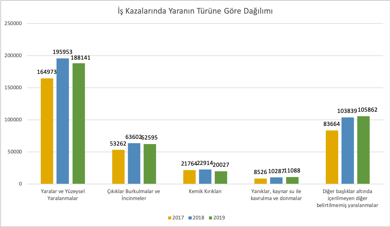 İş kazalarında yaranın türüne göre dağılımına bakıldığında, en çok yaralar ve yüzeysel yaralanmalar, ikinci sırada çıkıklar, burkulmalar ve incinmeler ve üçüncü sırada ise kemik kırıkları olarak yaşandığı görülmektedir.