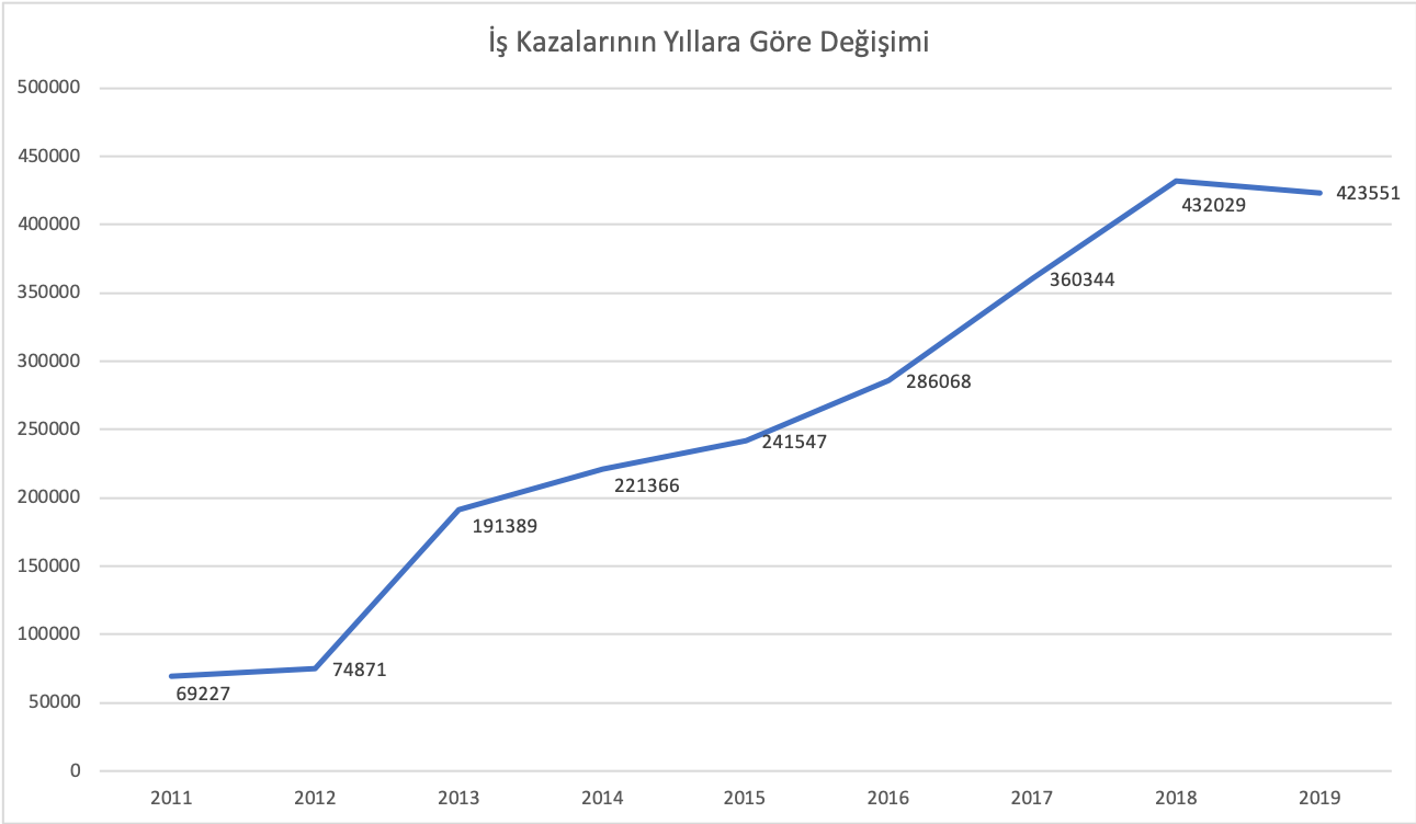 Ülkemizde gerçekleşen iş kazaları ve meslek hastalıkları ile ilgili veriler her yıl SGK tarafından yayımlanmaktadır. SGK istatistiklerine göre 2019 senesinde toplam 423.551 iş kazası kayıt altına alınmıştır. Buna göre her saatte bir 48'den fazla iş kazasının yaşandığı söylenebilir. Aşağıdaki grafikte iş kazalarının 2011-2019 yılları arasındaki sayıları görülmektedir. İş kazalarının sayısındaki artış, İş Sağlığı ve Güvenliği Kanunu sonrasında kayıt altına almadaki zorunluluklar ve kaza bildirimlerinin dijital ortama taşınması sayesinde olduğu söylenebilir.