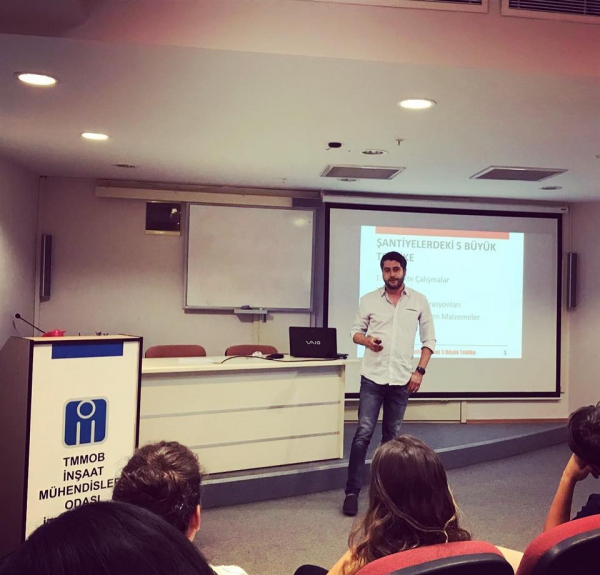 İnşaat Mühendisleri Odası İzmir Şubesi'nin düzenlemiş olduğu "Yeni Mezun İnşaat Mühendisleri Mesleğe Hazırlık Kursu"nun son gününde, "Şantiyelerde 5 Büyük Tehlike" konulu sunum 9 Ağustos 2018 tarihinde Sn. Özgün ANDİÇ tarafından gerçekleştirilmiştir.