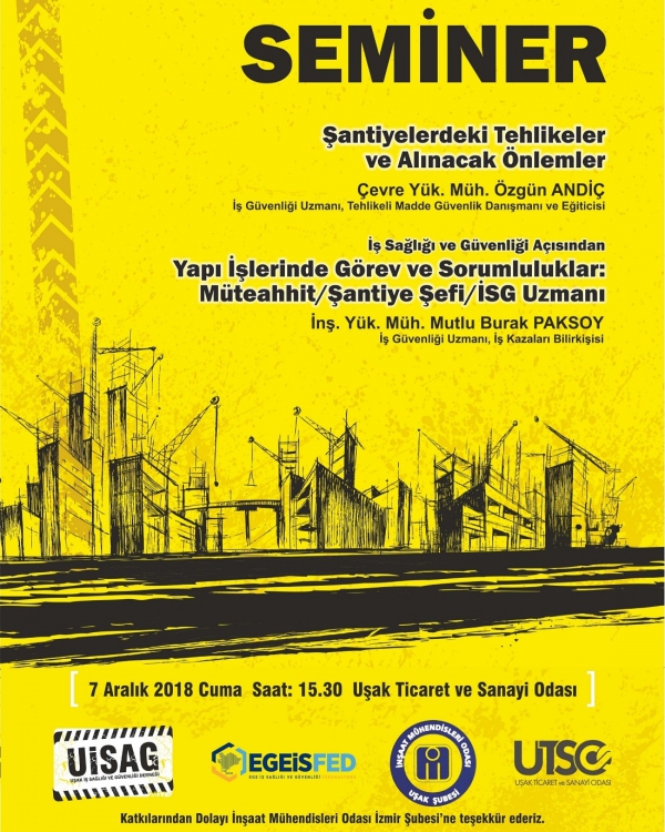 Uşak Ticaret ve Sanayi Odası, İnşaat Mühendisleri Odası İzmir ve Uşak Şubeleri ve Uşak İş Sağlığı ve Güvenliği Derneği'nin ortaklaşa düzenledikleri yapı işlerinde iş sağlığı ve güvenliği, şantiye şefinin sorumlulukları ve denetimlerde dikkat edilmesi gereken hususların anlatıldığı toplantı 7 Aralık 2018 tarihinde Uşak Ticaret ve Sanayi Odası’nda gerçekleşti. Karma İş Sağlığı ve Güvenliği kurucularından Özgün Andiç, "Şantiyelerdeki Tehlikeler ve Alınacak Önlemler" sunumu ile seminere katkıda bulunmuştur.